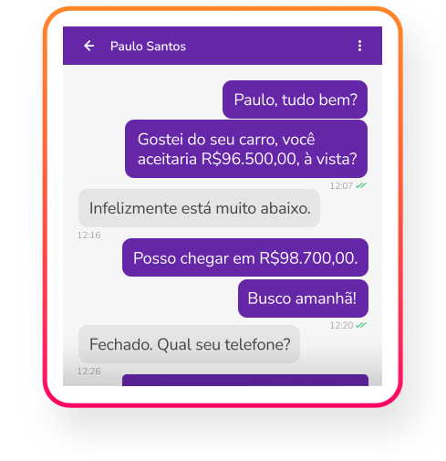 O lojista fica conectado a centenas de oportunidades diariamente onde, por meio de uma conversa informal e amigável, oferece uma proposta abaixo da tabela FIPE.